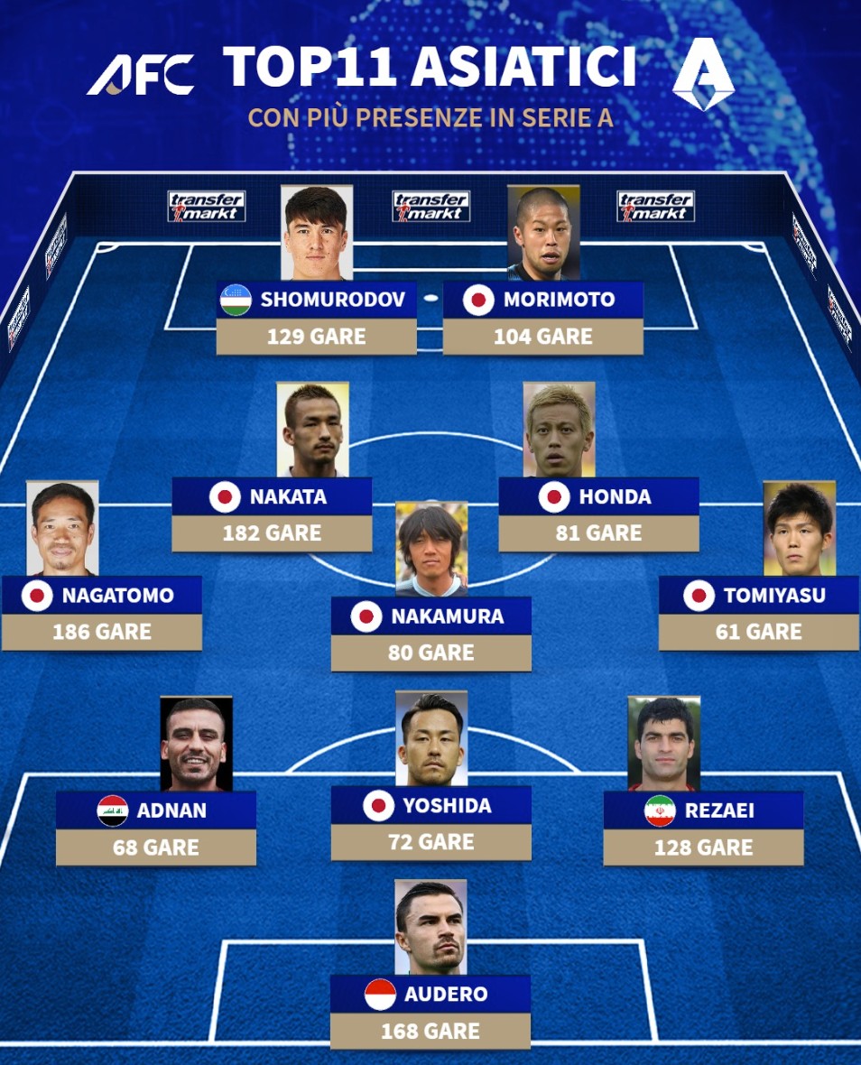 意甲出場數最多的亞洲球員11人陣容:長友佑都、中田英壽領銜