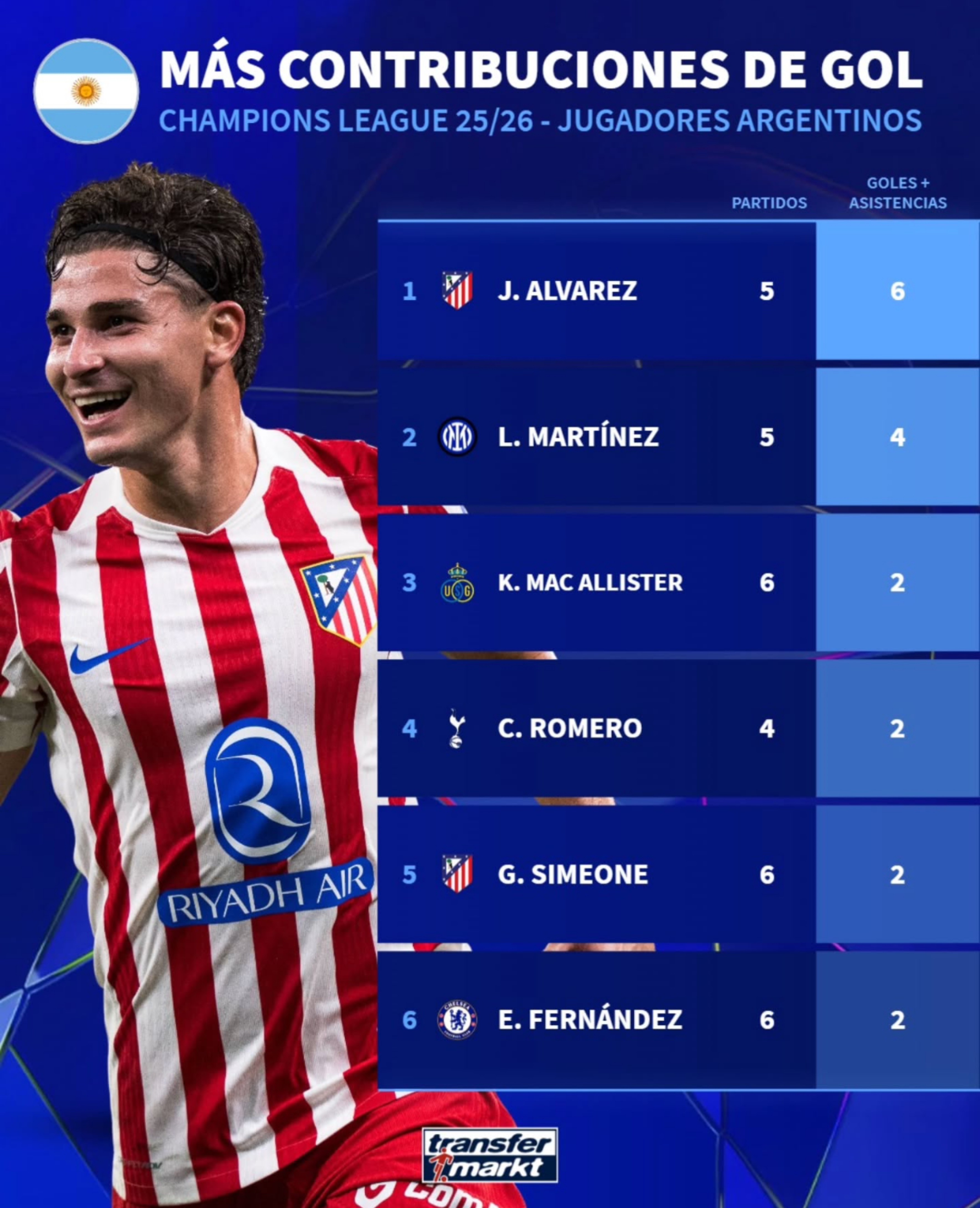 本賽季阿根廷球員歐冠參與進球榜:阿爾瓦雷斯6粒居首