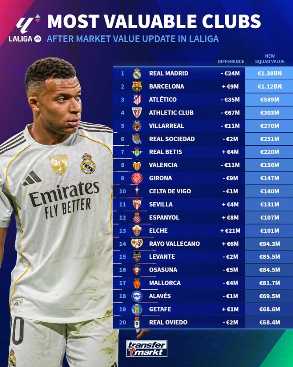 德轉西甲俱樂部身價排名:皇馬13.8億第1,最低奧維耶多5840萬