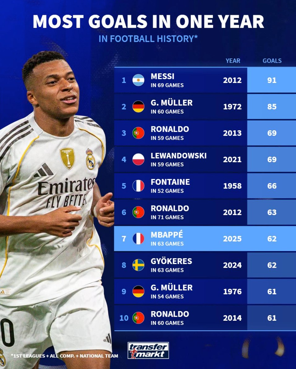 自然年國家隊+頂級聯賽俱樂部進球數歷史前10:梅西91球第1